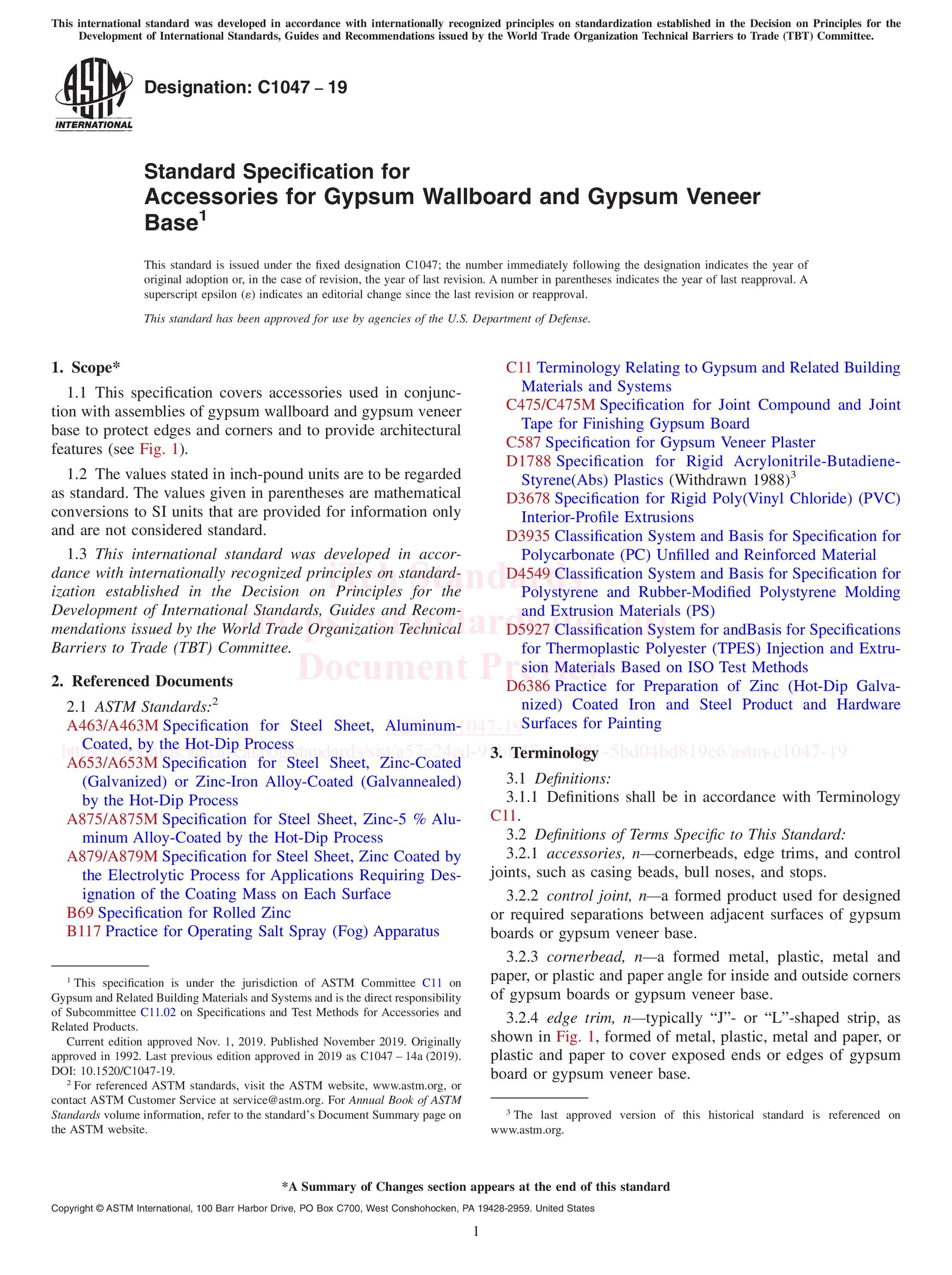 C1047-19 Standard Specification for Accessories for Gypsum Wallboard and Gypsum Veneer Base. 2019